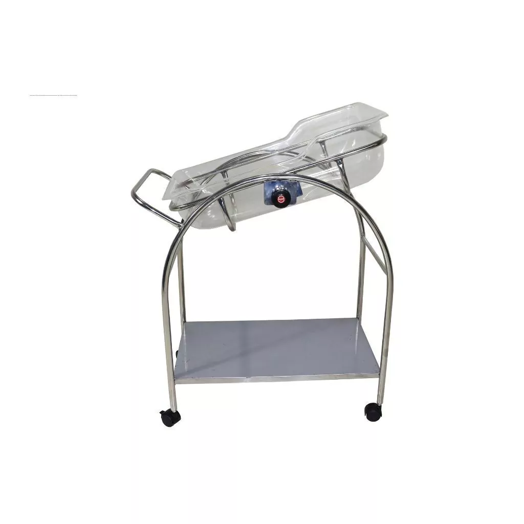O berço conta com cesto removível em acrílico transparente com bordas arredondadas, garantindo conforto e visibilidade do paciente. A prateleira inferior em chapa de aço inox 201 oferece espaço adicional para armazenamento de itens essenciais.